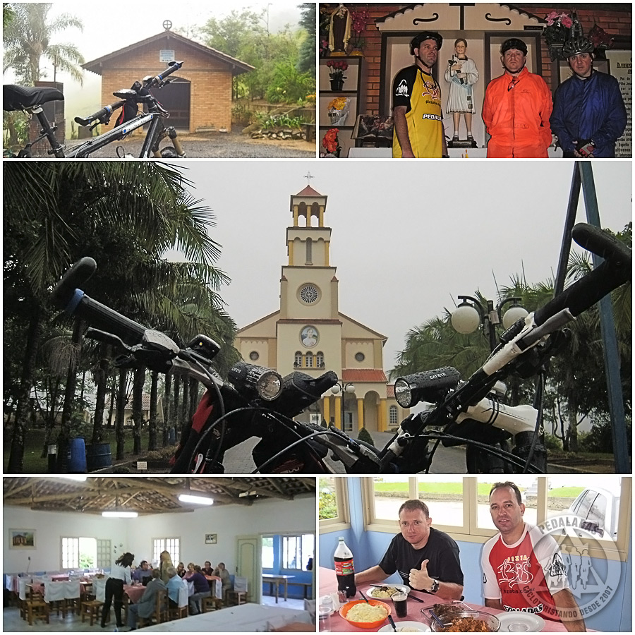 A região é bem famosa no círculo religioso, pois ali viveu Albertina Berkenbrock - que foi beatificada no final de outubro de 2007. Em São Luiz, fica a capela onde estão sepultados seus restos mortais. Independente da crença de cada um, é visível a seriedade do local e foi muito gratificante ter passado por lá. O local é freqüentado por pessoas extremamente bem intencionadas, que nos acolheram muito bem e que nos trouxe algum conforto. Segundo se diz, Albertina foi morta aos 12 anos de idade, em junho de 1931 - degolada após uma frustrada tentativa de estupro por um empregado de seu pai. Menina íntegra e de formação cristã, de elevada condição moral e espiritual, totalmente inclinada à bondade. Sua natureza pura fez-se formar entre o povo a opinião de que ela havia morrido mártir e por conta disso, deveria ser considerada Santa. Logo em seguida a sua morte foram relatadas várias graças concedidas por sua intercessão e o lugar de seu martírio e seu túmulo tornaram-se pontos de peregrinação. Por coincidência, no único restaurante da localidade (naquele momento parecia ser o único no mundo), acontecia a festa de aniversário de 94 anos do irmão da Beata Albertina. A festa não era aberta, mas uma simpática e caridosa moça nos falou que ninguém iria ficar sem comer. Quase choramos com essa tão linda sentença, por que naquele momento estávamos desesperados de fome. Comemos muito bem (em qualidade e quantidade!) e nos foi cobrado apenas um valor simbólico. Muito bacana mesmo. Abastecemos nossas mochilas com chocolate numa vendinha local e após um breve descanso, seguimos viagem de bem com a vida e com a barriga em paz...