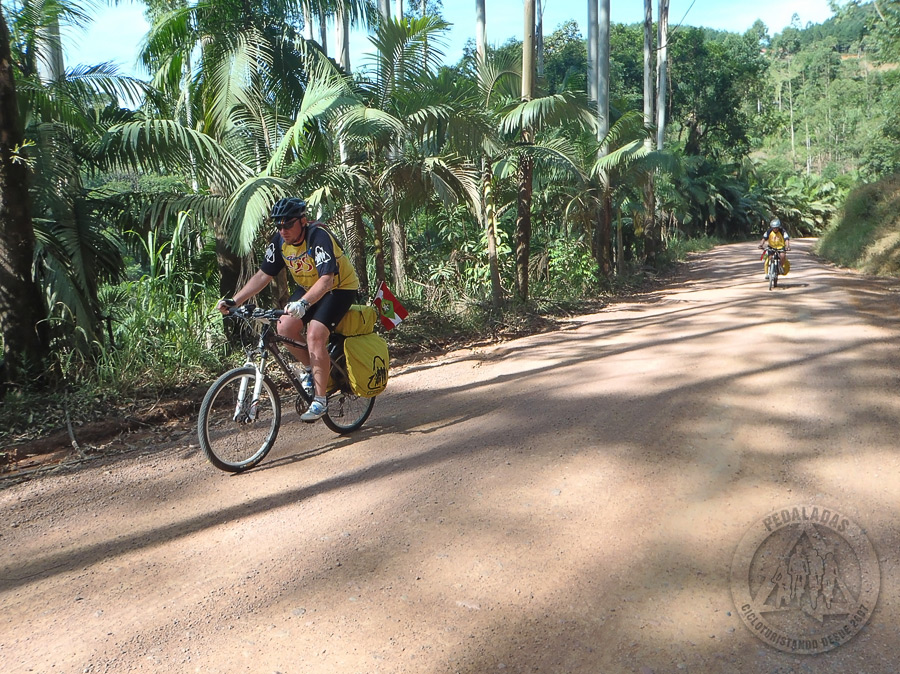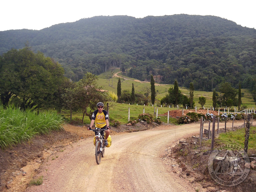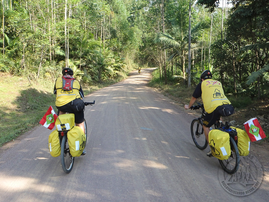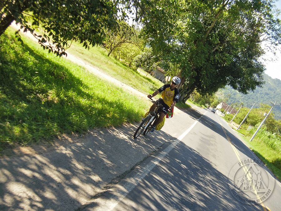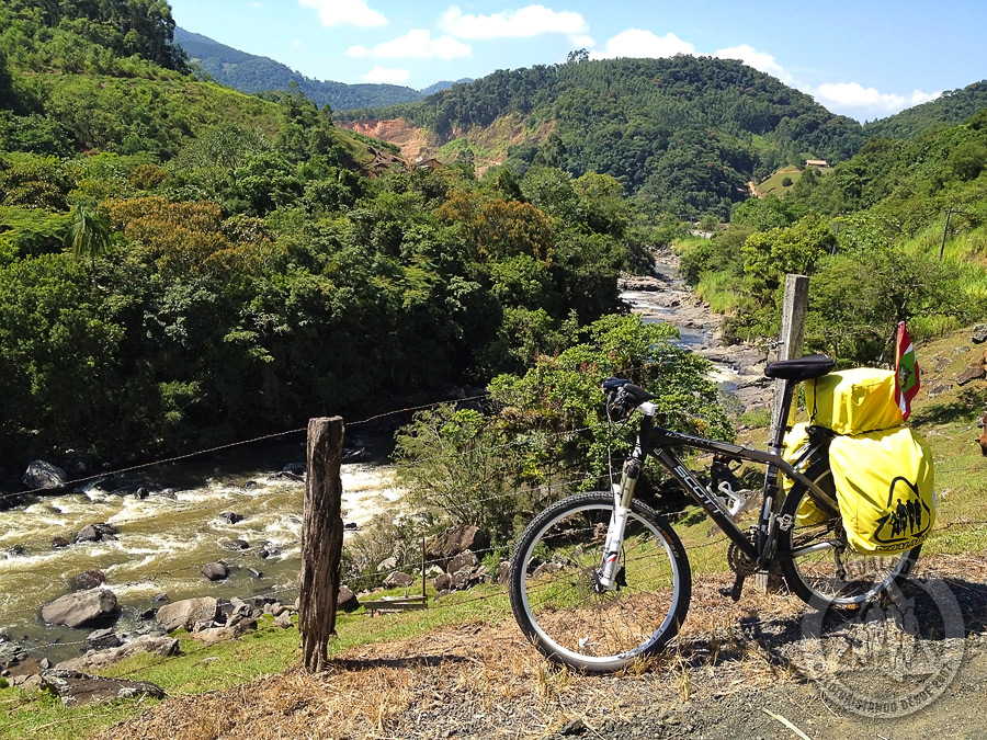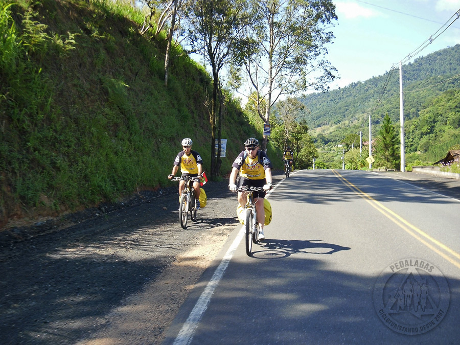 Outro café da manhã deveras mixuruca tomado bem às pressas. Subimos para os fajutos aposentos e socamos as tralhas nos empoeirados alforjes saindo o quanto antes do ruinoso hotel sem sequer olhar para trás, indo direto para o supermercado renovar o nosso estoque de água. A tranquila Timbó possui mais de 35 mil habitantes e embora já tenha incorporado algumas características de cidade grande, ainda é uma pacata cidadezinha do Vale Europeu catarinense onde tudo funciona perfeitamente. Limpa, organizada e muito bem cuidada em todos os aspectos, fazendo jus a alcunha de “Pérola do Vale”. Seguimos para Benedito Novo chegando consideravelmente antes do esperado – o que nos deixou bastante encasquetados, já que havia a expectativa de uma grande subida no início da manhã e raramente a gente se engana para algo melhor. O curioso é que o "Benedito" do nome da cidade deriva do latim benedicto, que significa “abençoado” – mas tenham certeza que se refere somente para quem está de carro. Os desafortunados de bicicleta penam horrores para chegar até lá em riba... Até demorou um pouco, mas quando começamos a subir – não paramos mais!