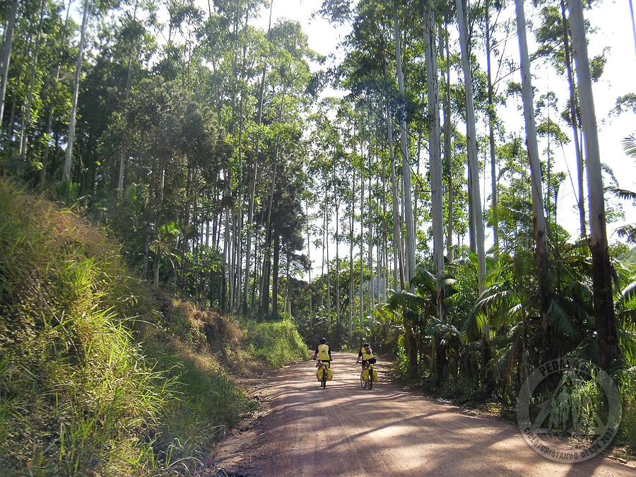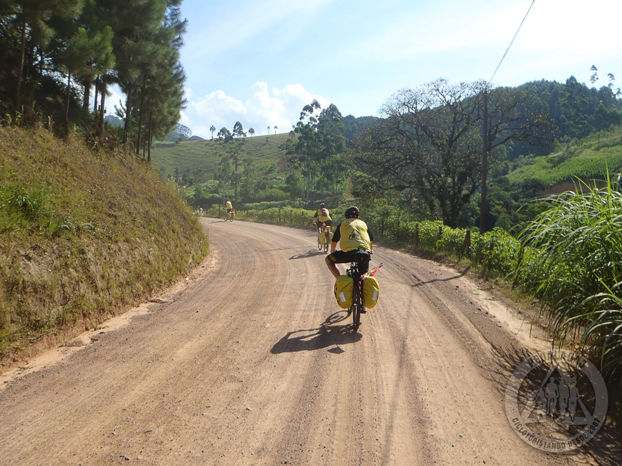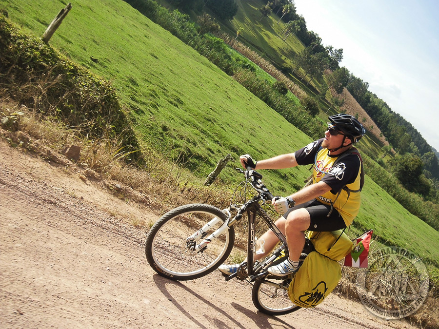 No vértice do interminável dia, encontramos uma boa alma com a qual papeamos por um bocado de tempo. Conversamos sobre várias coisas que entreteve o nosso pequeno descanso. Falávamos sobre o potencial do turismo ecológico da região e do andamento do projeto de uma tirolesa de quase 2 km, quando de forma inocente o simpático senhor deixou escapar alguma coisa do tipo – daqui pra frente só desce! São 10 km de descida sem dar uma única pedalada... Lacrimejamos por educação e também por que no fundo ainda temos uma alma esperançosa que crê em coisas absurdas, mas de fato não acreditamos naquela balela (10 km morro abaixo? Não mesmo!). Já fomos enganados tantas vezes com esse papo de “agora só desce” que o nosso cérebro rejeita esse tipo de inconveniência. De qualquer forma, demos o benefício da dúvida para o bem intencionado senhor e seguimos otimistas, embora bastante desconfiados. Se não subir mais, já está bom – pensamos resignados. O cenário seguinte é simplesmente inenarrável. Não foram os 10 km profetizados, mas chegou perto disso. Foi disparada a maior e mais emocionante descida que já fizemos. Por algum tempo esquecemos da regrada vida adulta e descemos felizes feito crianças e imprudentes como descabeçados adolescentes. Chegamos ao sopé do morro intactos e totalmente revigorados, entusiasmados como nunca. Num êxtase coletivo, cada um dava a sua versão da eletrizante descida numa animada e duradoura prosa.