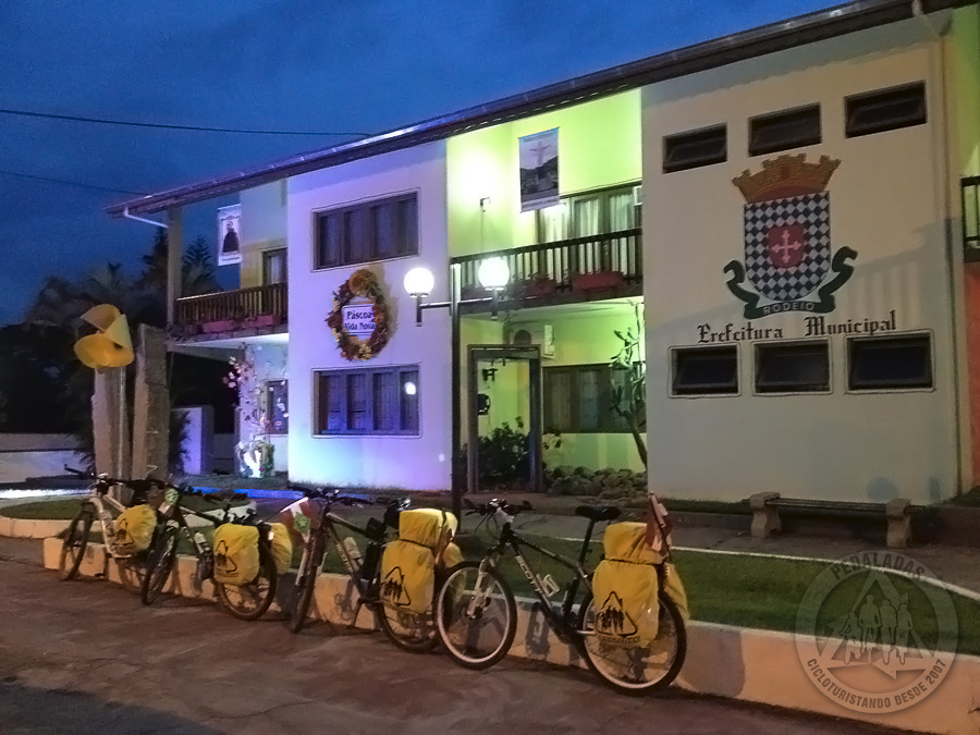 A sensação de exaustão havia sumido e cruzamos a bacana cidade de Rodeio muito calmamente. Ainda havia mais um significativo trecho de pelo menos 15 km a serem pedalados, passando por uma estradinha de chão que segue paralela a BR-470. Satisfeitos com a cota de estrada do dia e até um pouco de saco cheio de tanto chão e poeira e já pensando no conforto do hotel, optamos por seguir pelo asfalto. Com pista simples e excessivamente movimentada, possuindo vários trechos sinuosos e muito mal sinalizada – a BR-470 é um verdadeiro pesadelo para nós que brincamos de bicicleta. Pedalamos o mais rápido que podíamos para aquele momento e acabamos cruzando a cidadezinha de Ascurra sem quase ao menos perceber. Chegamos a Apiúna por volta das 19h30, um pouco tensos pelo risco assumido de se pedalar de noite numa rodovia tão horrorosa, embora satisfeitos com a essa sensação estranha, de vários sentimentos misturados relativos a tudo o que passamos durante o duradouro dia. O hotel era muito bom e o restaurante ficava convenientemente a poucos passos de nossos quartos. A comida não foi das melhores, provavelmente sobras requentadas do almoço, mas comemos assim mesmo e saímos satisfeitos (um Chicabon depois de uma janta ruim sempre ajuda a melhorar a sensação). Roberto reclamou um pouco, mas não havia muito que fazer e o jeito foi se conformar. Cansados demais para se preocupar com a forte chuva que caía naquele instante, aproveitamos o sugestivo barulho de sono para irmos dormir um pouco mais cedo que o normal.