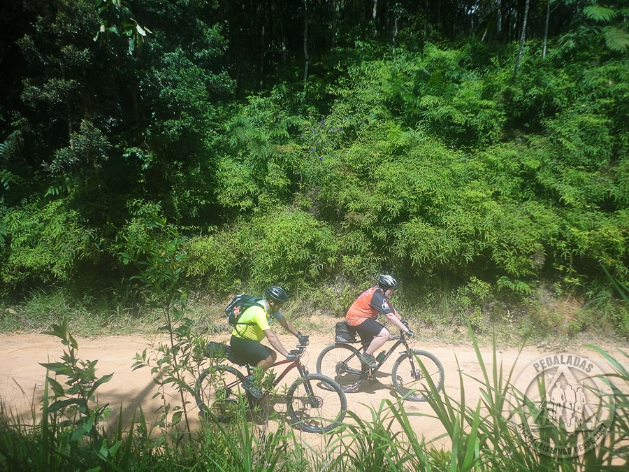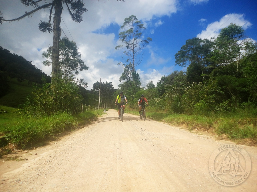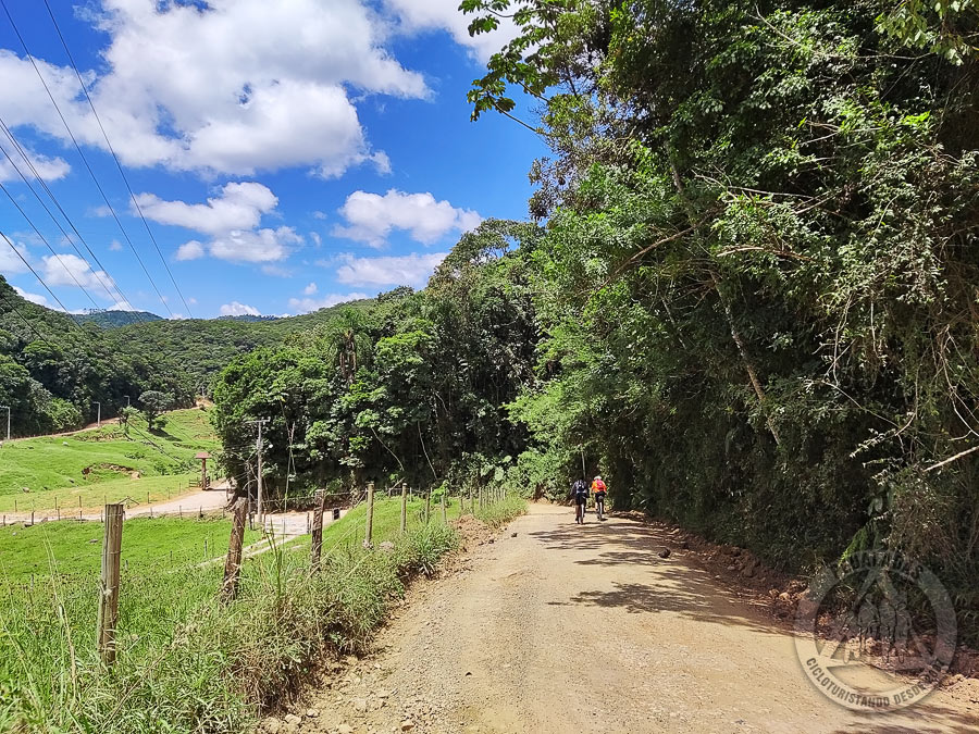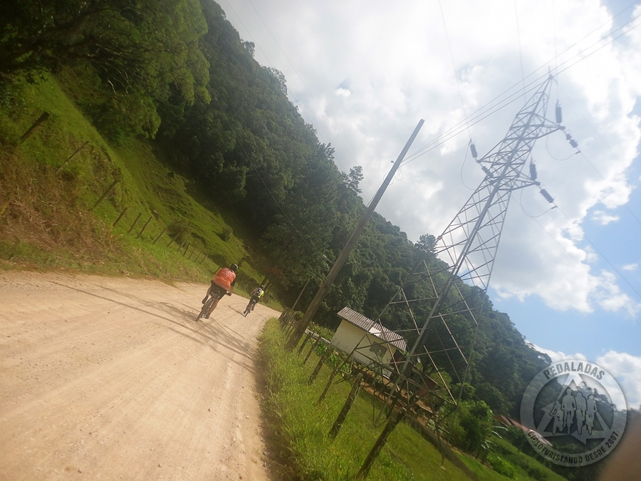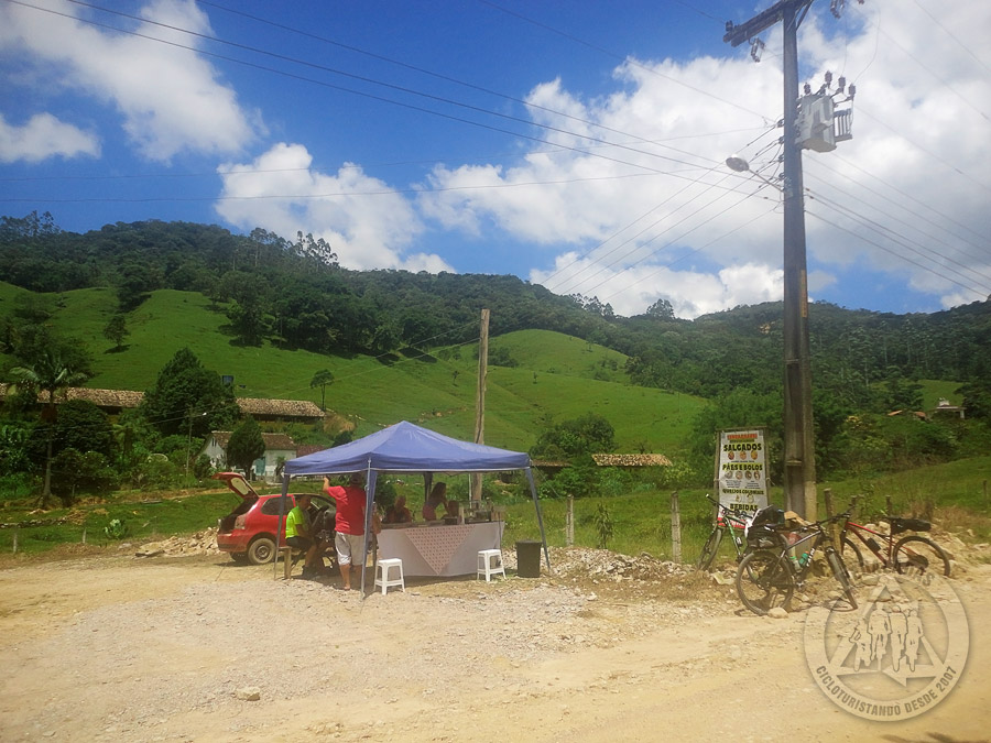 Já distante da vista do tal gigante adormecido, cruzamos brevemente o espaço urbano de Santo Amaro da Mulher do Imperador e seguimos caminho muito rapidamente pela estrada da Varginha, decepcionados por novamente não avistar nenhuma criatura fantástica ou entidade extraterrestre ou sequer um mero OVNI. Na Alta Varginha nos deparamos com a primeira grande subida do dia e sem delongas, o sol verteu seus raios em uma desagradável abundância em nossos cocurutos. Empoeirada e sem sombra, a SC-281 - estrada esburacada que liga São Pedro de Alcântara a Angelina -, foi a nossa constante na maior parte do pedal e segundo dizem, será finalmente asfaltada qualquer dia desses. Sem passar por uma birosca aberta por muito tempo, sofremos com o calor de 42º na moleira e somente lá pelas tantas, já quase sem água e um pouco antes somente de começar a subir de verdade foi que nos deparamos com uma providencial barraquinha de beira de estrada que acabou se tornando um bufê de coisas geladas para o trio excursionista.