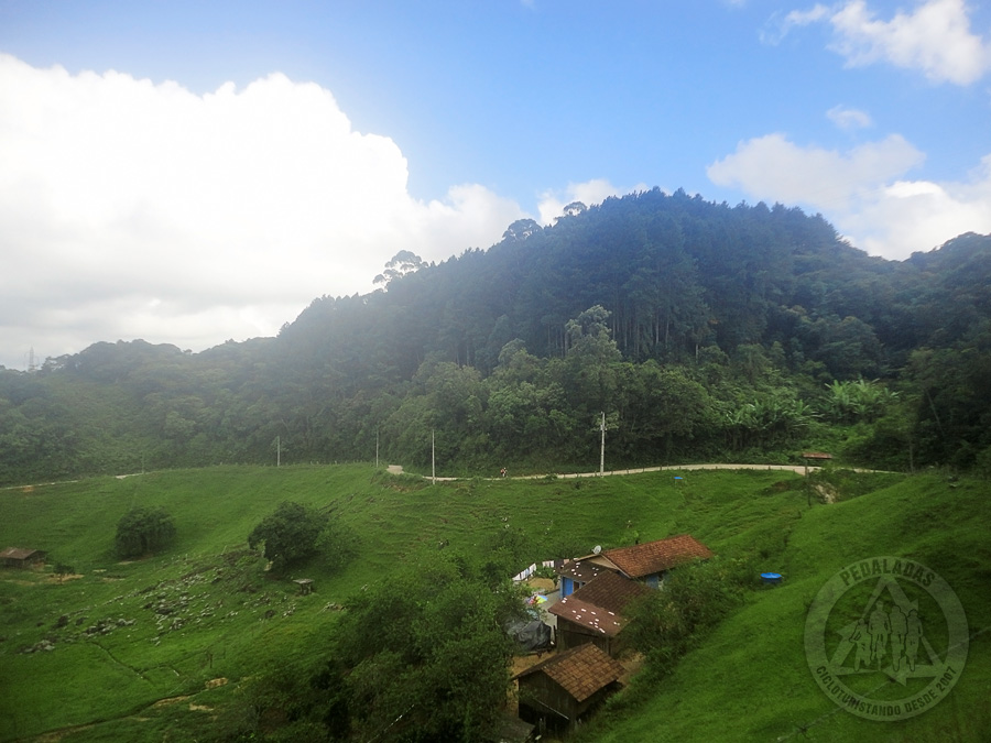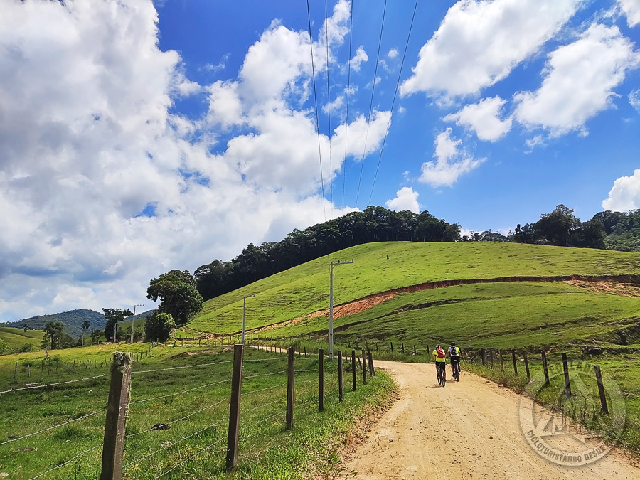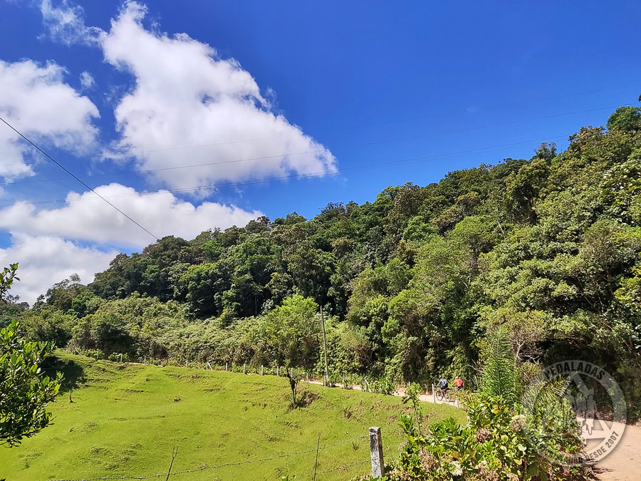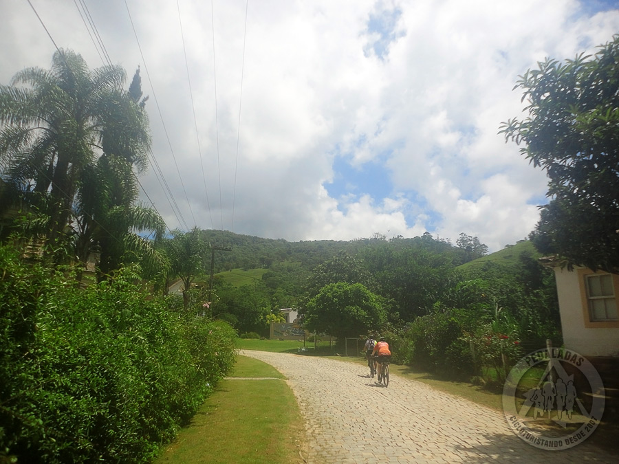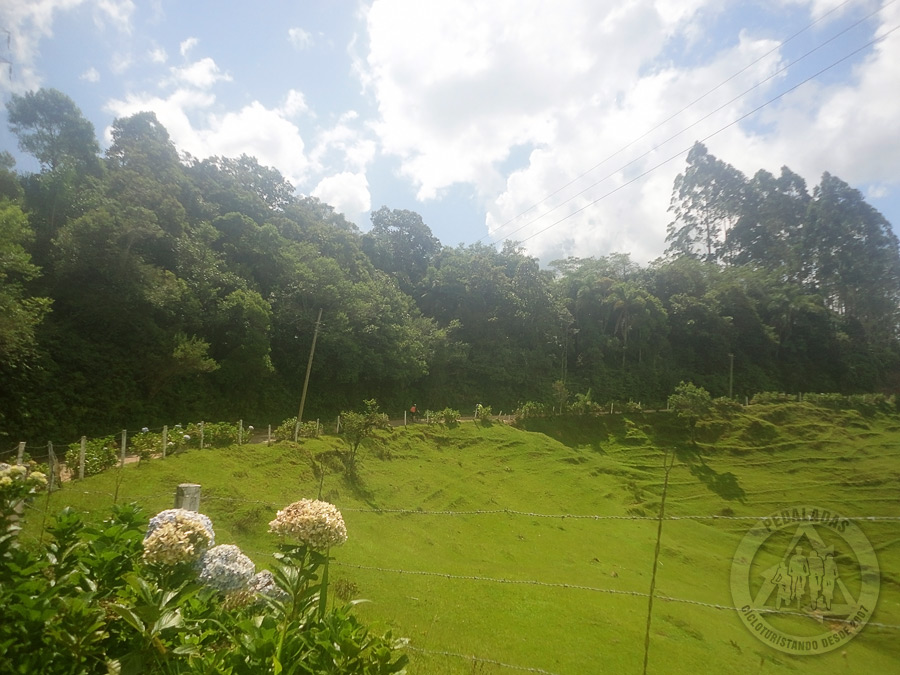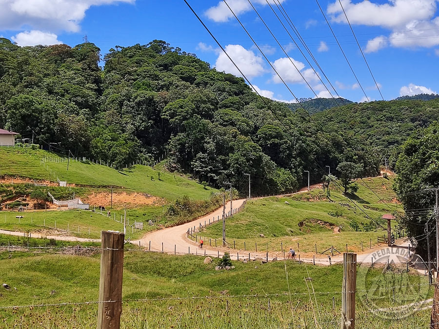 Já distante da vista do tal gigante adormecido, cruzamos brevemente o espaço urbano de Santo Amaro da Mulher do Imperador e seguimos caminho muito rapidamente pela estrada da Varginha, decepcionados por novamente não avistar nenhuma criatura fantástica ou entidade extraterrestre ou sequer um mero OVNI. Na Alta Varginha nos deparamos com a primeira grande subida do dia e sem delongas, o sol verteu seus raios em uma desagradável abundância em nossos cocurutos. Empoeirada e sem sombra, a SC-281 - estrada esburacada que liga São Pedro de Alcântara a Angelina -, foi a nossa constante na maior parte do pedal e segundo dizem, será finalmente asfaltada qualquer dia desses. Sem passar por uma birosca aberta por muito tempo, sofremos com o calor de 42º na moleira e somente lá pelas tantas, já quase sem água e um pouco antes somente de começar a subir de verdade foi que nos deparamos com uma providencial barraquinha de beira de estrada que acabou se tornando um bufê de coisas geladas para o trio excursionista.