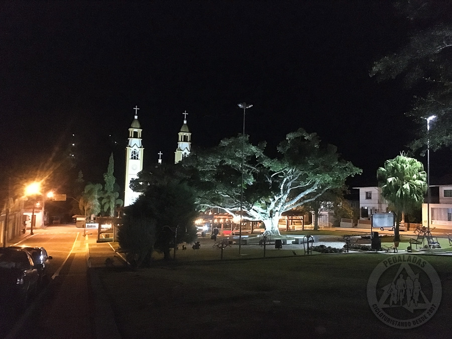 De muito bom grado aceitamos a trégua do sol e subimos os morros finais curtindo RAMONES e penando menos que de costume. Ainda era dia quando atravessamos o centrinho de Angelina em direção a conceituada e movimentada padaria local, muito bem habilitada em atender seres pedalantes esfomeados. Considerando a pequena TV de tubo com imagem horrorosa, chuveiro estilo conta-gotas e o ventilador de teto tão alto que parecia não fazer vento, ficamos com a desagradável sensação de termos pagado um pouco caro pelo pernoite na pacata hospedaria. De banho tomado e soneca tirada, caminhamos por um par de quilômetros até o local onde acalmaríamos a fome sem ver nenhum ser humano perambulando pelas redondezas escuras que separam o hotel da lanchonete. Enquanto éramos fartamente servidos de três modestos X-egg (com e sem carne), fritas, palitinhos de queijo e vários litros de Coca-Cola bem gelada, presenciamos um avinhado ser perto do fim da meia idade fazendo jus ao sábado de Carnaval escafedendo descaradamente após dar ré e bater com seu carro numa motocicleta estacionada. Aparentemente ninguém se emocionou com o acontecido, além apenas do desafortunado proprietário da motoca que ainda descrente ao acontecido, franziu o cenho e saiu atrás do sisudo malandro que naquela altura dos acontecimentos deveria estar bem ao longe. Antes de voltarmos para a hospedagem, demos uma incerta na formosa gruta de Nossa Senhora de Lourdes e pouco depois da meia-noite já estávamos roncando estatelados na confortável cama da estalagem, sonhando com o desjejum da manhã seguinte.