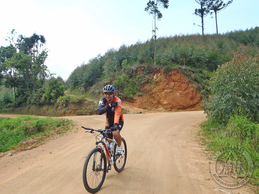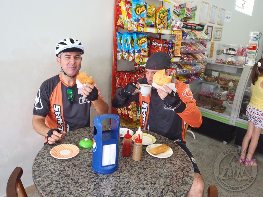 GPS ligado e funcionando com a rota bem definida, finalmente as canelas foram esticadas e a diversão começou. O tempo estava quente e desde o início vimos um Roberto silencioso. Maurício nos contou que na noite anterior ele havia tomado “umas duas” taças de vinho além da conta e por isso a inhaca da preguiça tomava conta do corpo dele. Na parte rural do município os morros finalmente chegaram e a temperatura do ambiente foi aumentando cada vez mais. Por sorte encontramos uma lanchonete que ajudou o Roberto na recuperação de suas devidas forças. Estava com sinais de pressão baixa e um tomate cortado em rodelas e sal foi a salvação do dia para ele e também para nós. Depois da simpatia a base de tomate - Roberto virou um galo jovial daquele que garganteia nas alvoradas com vigor infinito.