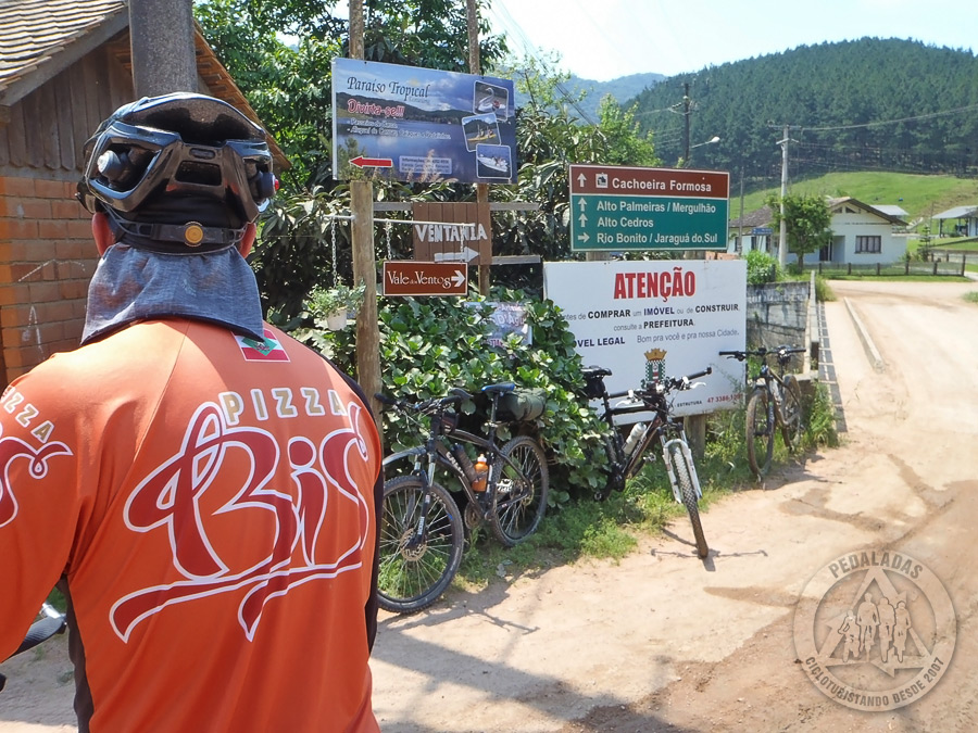 Rumamos pela BR-470 ao destino do dia ouvindo clássicos do rock do saudoso anos 80 e já em Rio dos Cedros, resolvemos deixar o carro estacionado nos arredores da igreja principal da cidade. Primeiro o Roberto parou de um lado e ali retiramos bicicletas e tralhas do carro, depois não se contendo - decidiu que o lugar não era bom o suficiente e foi procurar um melhor. Achou do outro lado com uma árvore para fazer sombra. Foi uma verdadeira ladainha até ficarmos prontos literalmente. Mal pedalamos e já paramos numa padaria para que a dupla Roberto e o Maurício tomassem seus respectivos cafés.