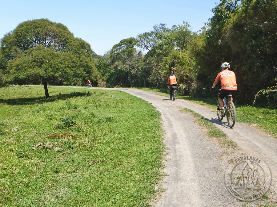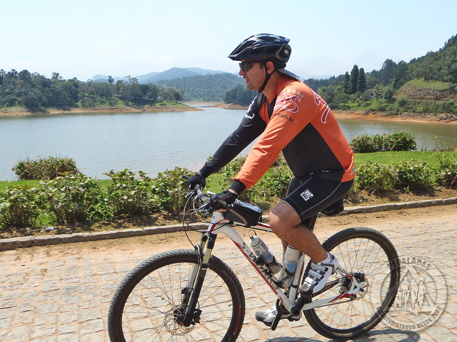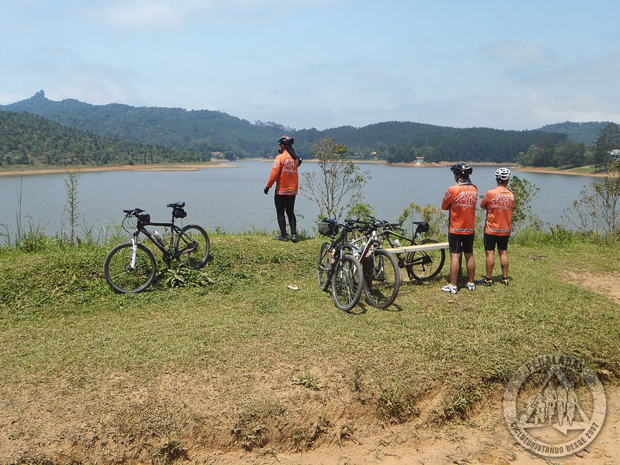 Descobrimos ali na lanchonete que estávamos chegando à região dos lagos de Rio dos Cedros. Uma verdadeira surpresa para nós sobre o local. Não sabíamos o quão era bonito nas paisagens de matas e ainda com lagoas grandes de belo visual. Com o calor apertando cada vez mais, parávamos em várias sombras formadas pelas árvores no transcorrer do percurso. Aproveitávamos para agradecer ao Éder por ter a brilhante idéia de levar o bagageiro e a bolsa com várias guloseimas de enganar o apetite. Tinha sanduíche, wafer , laranja, sachê de mel e barrinhas de cereal... Quase uma lanchonete móvel!