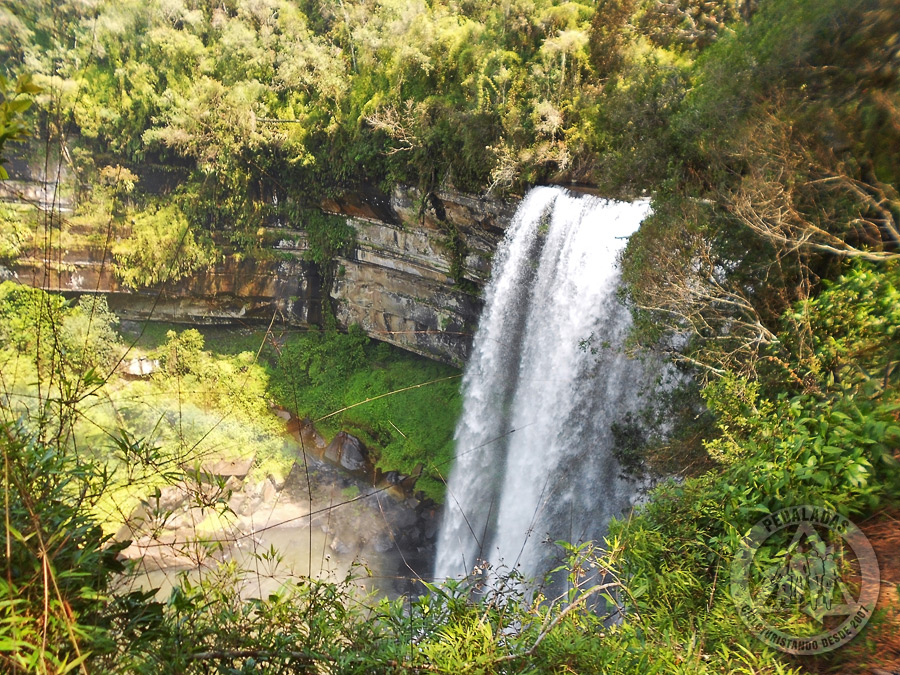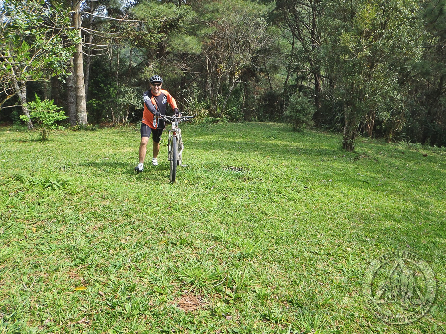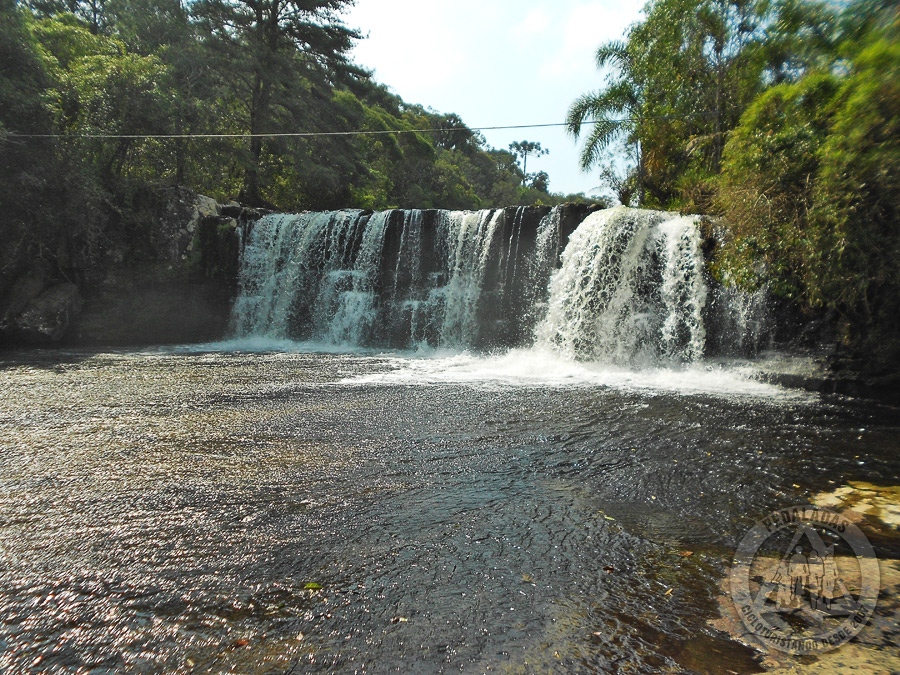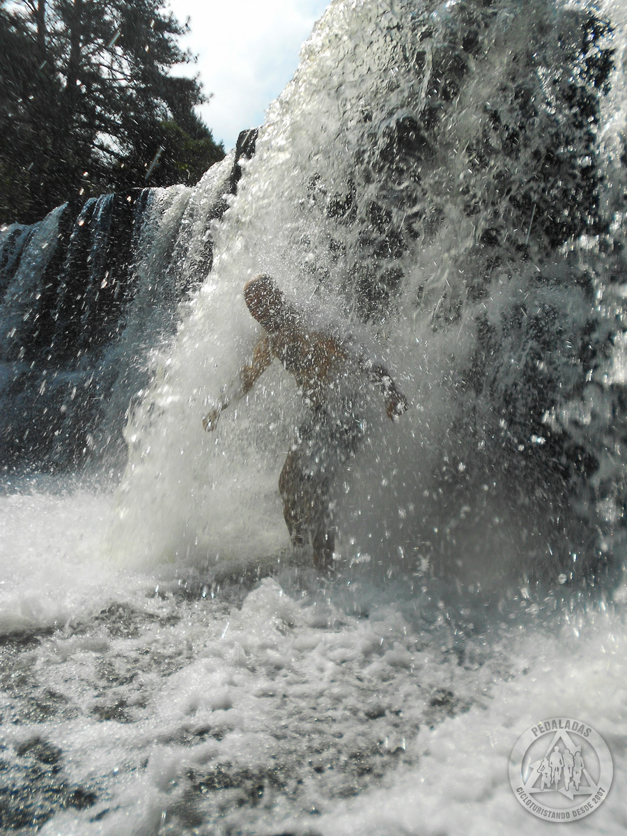 Depois da região dos lagos começamos a subir novamente e uma placa indicou que o objetivo do dia estava tão logo à frente – a tal da Cachoeira Formosa. Mas para chegar lá, penamos um bocadinho num morro nada agradável com o sol das 13 horas na lomba. Por fim, chegamos numa placa abençoada que mostrava faltar apenas 1 km ao destino. O mais legal foi atravessar uma ponte, abrir uma porteira e depois fechá-la para seguir numa estradinha de fazenda extremamente bonita - já escutando o som das águas. Avistamos uma casa e mais uma porteira fechada. Chegando perto da tal porteira, um rapaz veio da casa e falou que podíamos visitar a vontade, porém pagando R$ 5,00 por cabeça. Não sabíamos o que vinha pela frente, mas foram cinco pila muito bem gastos. O rapazola nos falou que havia duas quedas e que era só seguir a trilha. Logo chegamos e ficamos de cara com a exuberância do local. Uma queda d’água de impressionar os pseudopedalantes. O difícil foi achar um lugar que não fosse bonito para ver a queda da majestosa cachoeira. Deixamos as bicicletas devidamente aprumadas nas árvores que ladeavam o caminho até a laje onde a água estava numa temperatura convidativa de ficar de molho e todos foram molhar as canelas numa refrescância de causar inveja aos infelizes que não foram. Num certo momento olhamos para o lado da queda e o Roberto já estava numa laje praticamente na borda infinita que se formava pela nossa ótica de vê-la. Maurício logo foi até lá, mas um fato curioso também surgiu: uma bela etiqueta estava à mostra da sua bermuda térmica. Resumo do próprio Maurício: - vixi, a pressa foi tanta pela perda da hora que até a bermuda foi colocada do avesso . Saímos em direção ao outro lado que tinha uma queda menor, porém da mesma formosura no visual. Roberto prontamente foi para baixo da queda e ali começou um show a parte. Um show cover estilo Freddy Mercury. Foi uma cantoria que chamou atenção até do guapeca que circulava na área da casa.